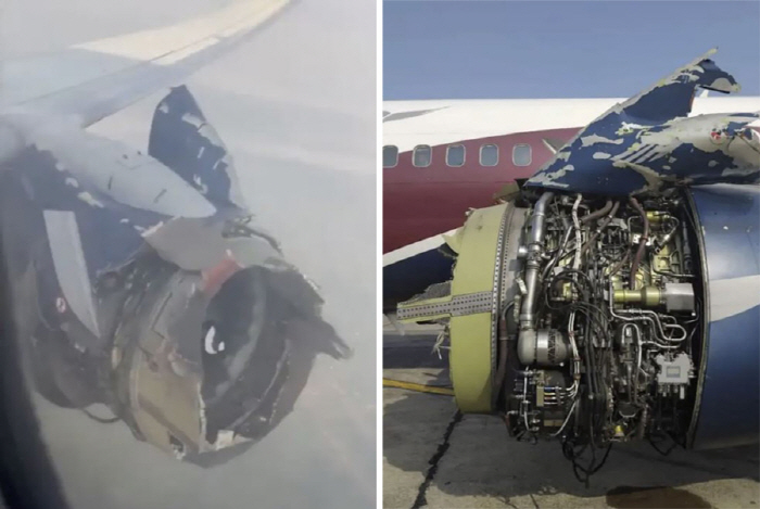 보잉 737 기종으로 알려진 이 비행기는 왼쪽 엔진이 공중에서 폭발해 심하게 손상됐다. 비행기는 가까스로 긴급 착륙했다.