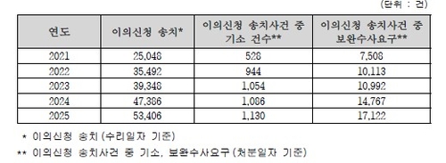 이의신청 송치 사건 중 검찰이 경찰에 보완수사를 요구한 사건 수도 2021년 7천508건, 2022년 1만113건, 2023년 1만992건, 2024년 1만4천767건, 2025년 1만7천122건으로 매년 증가 추세다. 2021년을 기준으로 4년 만에 2.3배로 급증했다.