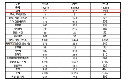 무직은 6천262명으로 절반 가까이 차지했다. 이외에도 ▲ 단순노무·기능직 1천582명 ▲ 숙박·기타 서비스 1천454명 ▲ 기타 전문·관리직 552명 ▲ 사무직 469명 ▲ 학생 468명 등이 뒤를 이었다.
