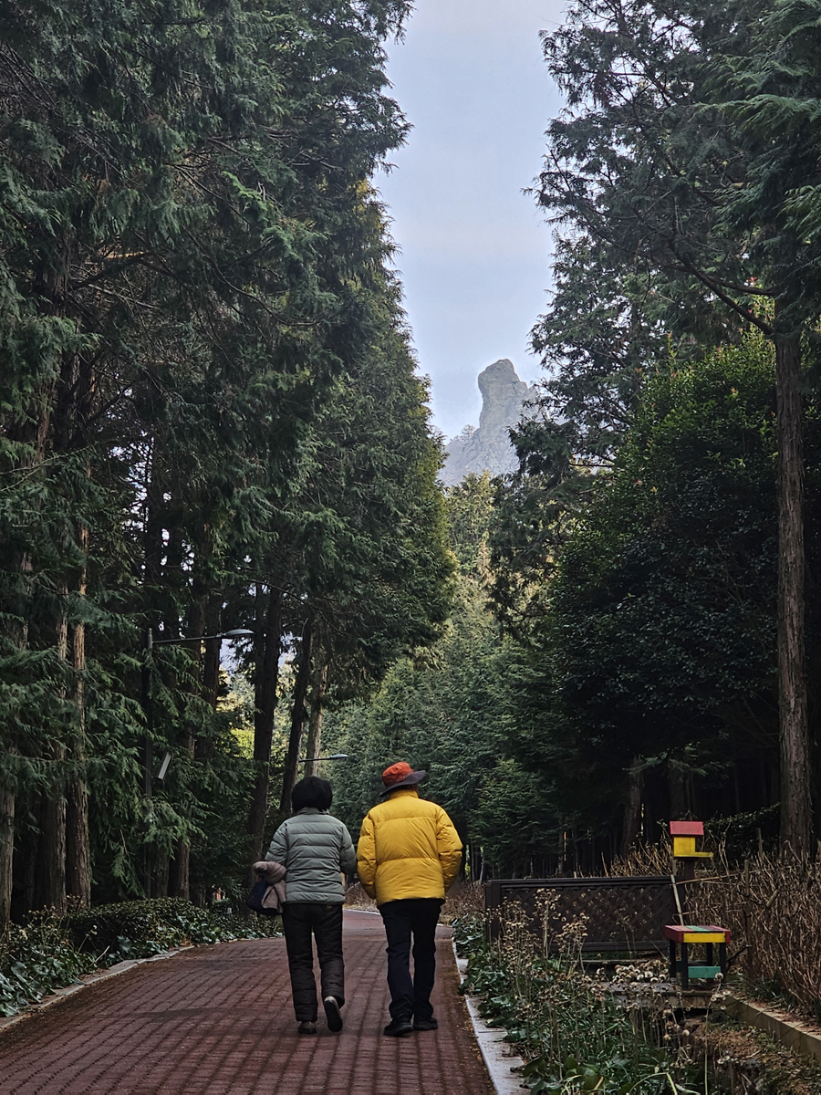 ◇정남진 편백숲 우드랜드는 장흥군의 대표 웰니스관광지 중 하나다. 피톤치드를 즐기는 동시에 천관산의 며느리봉(사진 내 봉우리)을 비롯해 다양한 볼거리가 가득하다. 사진=김세형