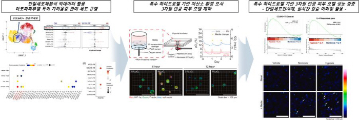 인공 피부 모델 성능 검증 과정. 단일세포 빅데이터 분석을 통한 아토피피부염 특이 섬유아세포(COL6A5+ FB) 규명, 특수 하이드로젤 기반 저산소 환경 모사 3차원 인공 피부 모델 제작 및 단일세포전사체·실시간 칼슘 이미징을 활용한 모델 성능을 검증했다.