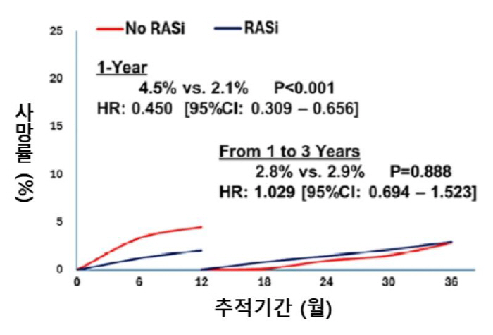 특히 이 시기에는 심장 기능(좌심실 구출률) 개선과 혈압 조절 효과가 비복용군보다 통계적으로 유의하게 높았다. 반면, 시술 후 첫 1년을 주요 심혈관 사건 없이 보낸 환자들의 12개월부터 36개월 사이의 레닌-안지오텐신계 저해제 지속 복용과 생존율에는 유의미한 상관관계가 발견되지 않았다.