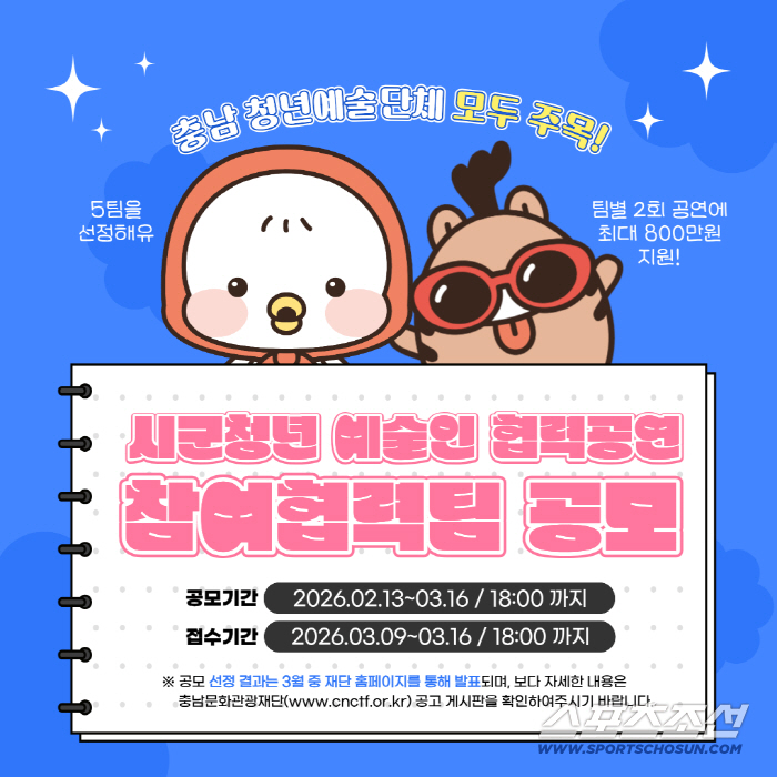 충남문화관광재단이 충남 청년 예술단체의 공연 기회 확대 및 도내 예술활동 기반 형성를 위해'시군 청년예술인 협력공연'의 2026년 참여협력팀 공모를 실시한다. 공모 접수는 3월 9일부터 3월 16일 오후 6시까지 이메일을 통해 온라인으로만 가능하다.
