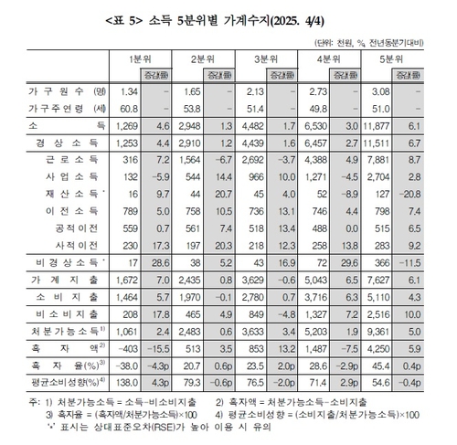 반면 2분위와 3분위는 가구 내 취업자 수 감소 여파로 근로소득이 줄며 전체 소득 증가율이 각각 1.3%, 1.7%에 그쳤다.