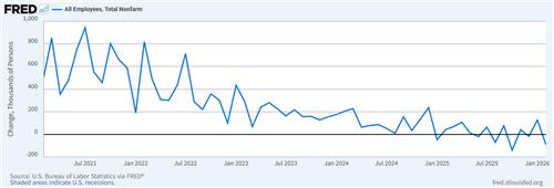 정부 셧다운의 일시적 영향을 받은 작년 10월 지표를 제외하면 2월 일자리 감소 폭은 팬데믹 직후인 2020년 12월(18만5천명 감소) 이후 가장 컸다.