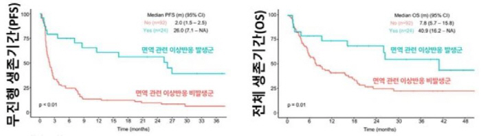 또한 이번 연구는 면역 관련 이상반응이 치료 효과와 연관될 수 있음을 실제 임상 자료에서 확인했다는 점에서도 주목된다. 치료 중 갑상선 기능 이상 등 면역 관련 이상반응이 발생한 환자군을 분석한 결과, 이러한 이상반응이 나타나지 않은 환자군에 비해 무진행 생존기간과 전체 생존기간이 유의하게 더 길었다. 이는 면역 관련 이상반응이 치료 반응을 예측할 수 있는 임상적 지표로 활용될 가능성을 보여준다.