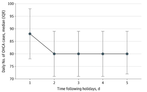 이 결과 연휴 다음날의 하루 병원 밖 심정지 발생 건수 중앙값은 88건으로, 일반 평일의 80건보다 유의하게 많았다. 통계적으로는 연휴 다음날 평일의 심정지 발생이 일반 평일보다 9% 높은 것으로 추산됐다.