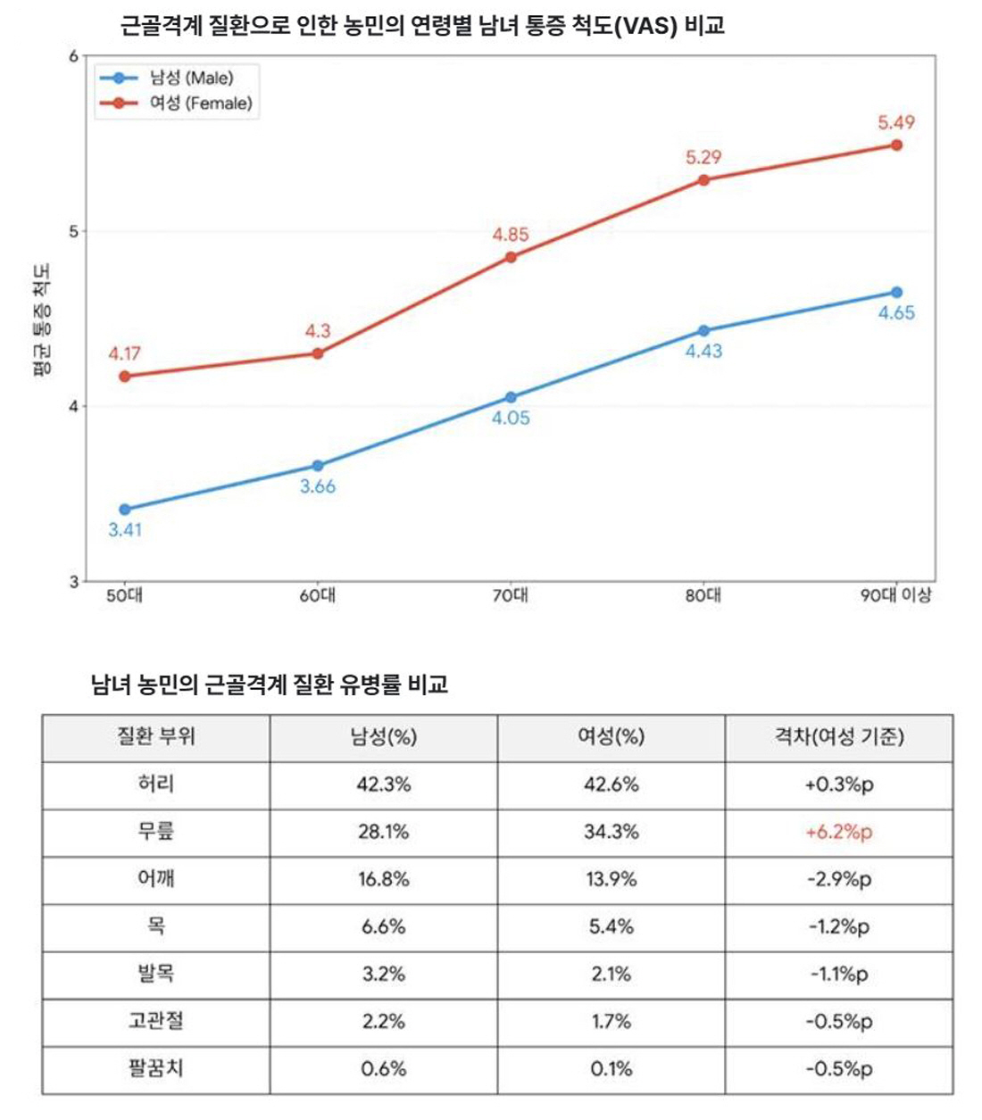 조사결과 근골격계 질환으로 4이상의 중등도 통증을 겪고 있는 여성 농민의 비율은 69%였으며, 남성은 55.8%였다. 특히 여성은 이른 나이인 50대부터 4.17의 중등도 이상 통증이 시작됐으며, 60대(4.30), 70대(4.85), 80대(5.29), 90대 이상(5.49)으로 연령이 증가할수록 통증의 평균 강도도 증가했다. 이는 남성이 50대(3.41), 60대(3.66)를 지나, 70대가 되어서야 4.05를 기록하는 것과는 차이가 있었다.