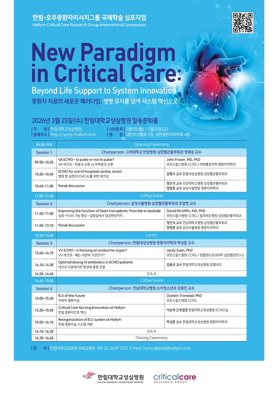 이번 심포지엄에서는 세계적 중환자 치료 연구기관인 호주중환자리서치그룹 석학들이 방한해 한림대학교성심병원 의료진과 함께 중환자 치료에 대한 발표를 진행한다.