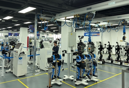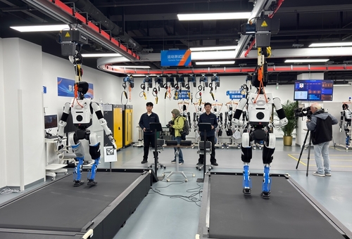작년 4월 이좡에서 열린 세계 첫 휴머노이드 로봇 하프마라톤 대회에서 우승을 차지한 '톈궁'(天工)의 새 로봇 제품들은 쿵쿵 소리를 내며 트레드밀(러닝머신) 위를 달렸고, 몇몇은 공중에 매달린 채 차례를 기다렸다.