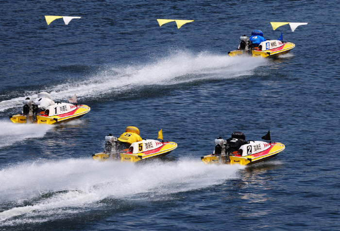 수면 위에서 펼쳐지는 짜릿한 스포츠 경정, 6명의 선수가 모터보트를 타고 동시에 순위를 다투는 이 수상 스포츠는 최고 시속이 약 80㎞에 달하며, 물살을 가르며 질주하는 모습은 마치 물 위를 날아다니는 듯 보인다. 그래서 경정 선수들에게 보호장비 착용은 중요한 경기 준비 과정이다.