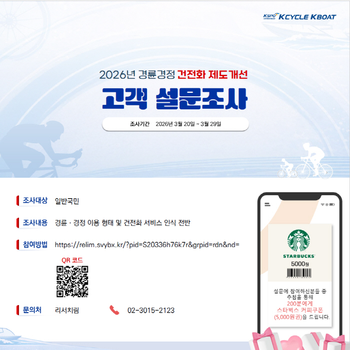 경륜경정총괄본부는 경륜·경정을 즐기는 고객이 건강하고 균형 잡힌 방식으로 이용할 수 있도록 상담, 교육, 홍보 등 다양한 건전화 사업을 운영하고 있다. 이번 조사는 오는 29일까지 진행되며, 경륜·경정 이용 고객을 대상으로 한다. 조사는 온라인(스피드온, 공식 홈페이지, SNS 등)을 통해 참여할 수 있으며, 참여자 중 추첨을 통해 200명에게 스타벅스 커피 쿠폰이 증정된다.