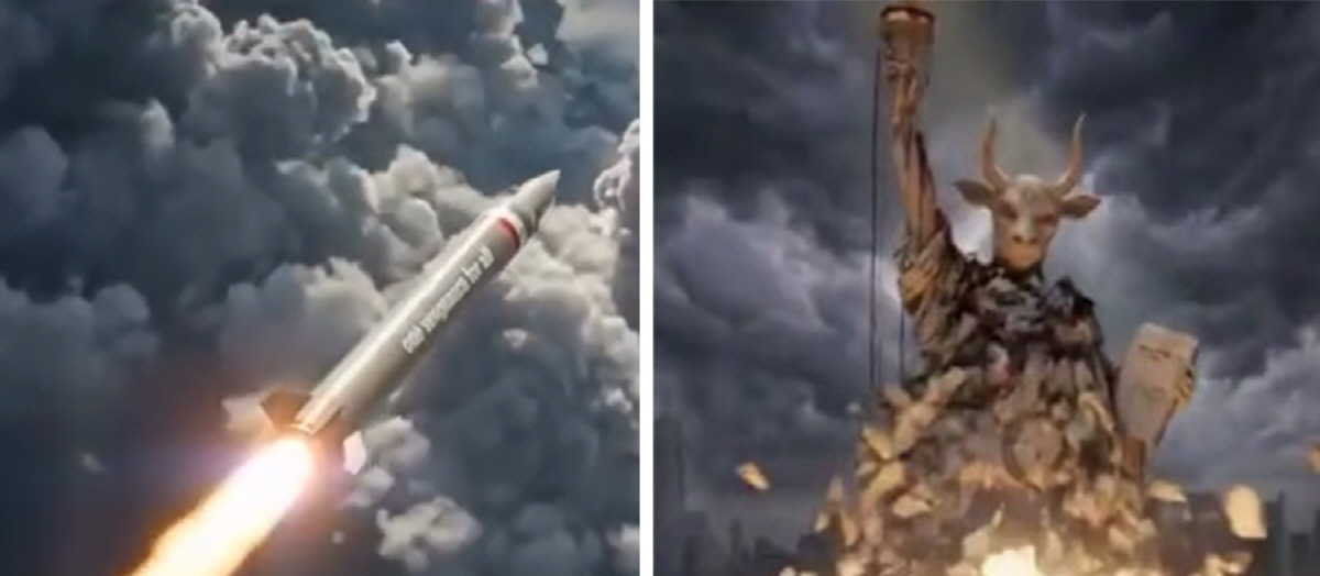 영상의 마지막은 자유의 여신상이 있는 뉴욕 항구를 배경으로 한다. 이 장면에서 여신상은 악마적 형상으로 변형돼 묘사되며, 이어 가상의 이란 미사일이 날아와 충돌하면서 거대한 폭발과 함께 구조물이 붕괴되는 모습이 연출된다. 잔해가 바다로 떨어지고 검은 연기와 화염이 치솟는 장면이 이어지며 영상은 마무리된다.