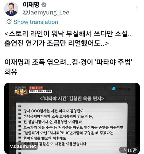 이재명 대통령은 27일 자신을 향해 제기된 '조폭 연루설'에 대해 "스토리라인이 워낙 부실하다"며 "쓰다만 소설"이라고 비판했다.
