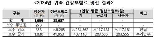 실제 사례를 보면 이런 경향이 뚜렷하게 나타난다. 건강보험공단의 '2024년도 건보료 정산 결과'를 보면 전체 대상자 1천656만명 중 보수가 늘어난 1천30만명은 평균 20만3천555원을 추가로 납부했다. 반면 보수가 줄어든 353만명은 평균 11만7천181원을 환급받았다. 나머지 273만명은 보수 변동이 없어 정산할 금액이 없었다.