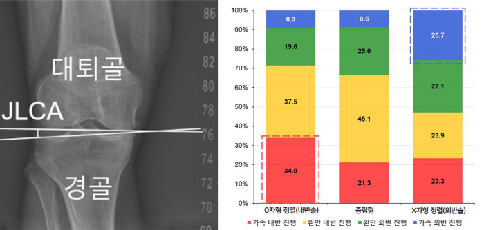 연구팀은 무릎 관절을 이루는 대퇴골과 경골 사이의 관절선이 벌어진 정도인 '관절선 수렴각(JLCA)'이 이러한 가속 진행을 예측하는 공통 지표임을 밝혀냈다. 초기에 측정된 JLCA가 1도 커질 때마다 O자형 환자에서 12.9%, X자형 환자에서 19.4%씩 가속 진행 위험이 증가했다. 특히 O자형 환자의 경우 관절염 중증도가 높을수록 가속 진행 위험이 증가했으며, 중등도 이상(Grade III, IV) 단계에서는 정상군(Grade 0) 대비 약 4~5배 높은 것으로 나타났다.