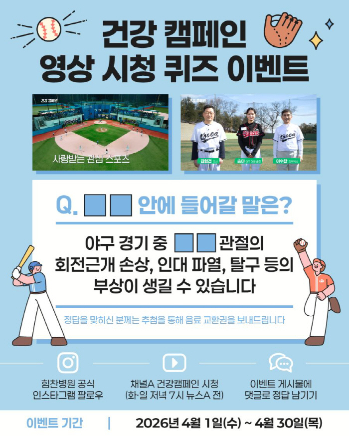 참여 방법은 힘찬병원 공식 인스타그램(@himchanhospital)을 팔로우한 뒤 댓글로 퀴즈의 정답을 남기면 된다. 이벤트는 2026년 4월 한 달간 진행되며, 정답자 중 추첨을 통해 음료 교환권을 증정할 예정이다.