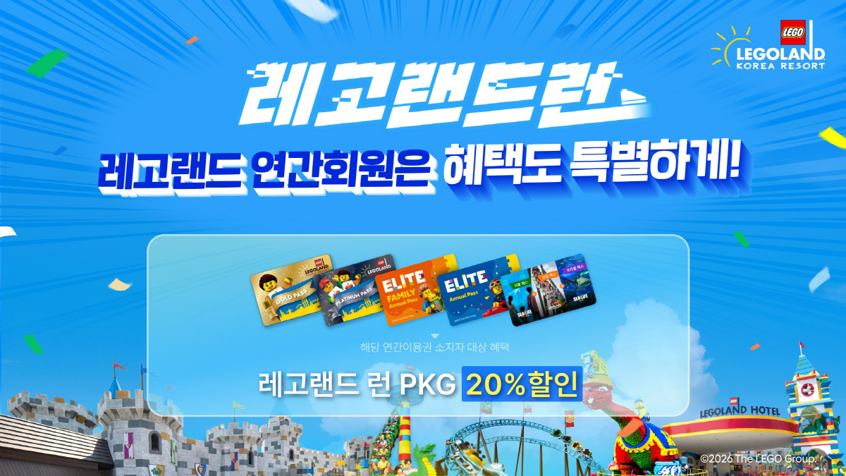 9일 레고랜드에 따르면 연간이용권 고객을 위한 대표 할인으로는 '2026 레고랜드 런' 참가 혜택이 대표적이다. 5월 16일 개최되는 레고랜드 런에 참가할 경우 참가비 20% 할인 혜택이 제공된다. 또 레고랜드 런 참가 패키지에 포함된 레고랜드 당일 이용권은 6월 30일까지 사용할 수 있는 '동반인 초청권'으로 교환이 가능하다. 호텔 숙박 혜택도 강화 하다. 5월까지 주중 최대 30%, 6월부터 토요일을 제외한 모든 숙박에 30% 할인을 적용한다. 불꽃놀이를 레고 불꽃으로 관람할 수 있는 '불꽃놀이 안경'과 함께, '닌자고 15주년 컬렉터 코인'을 증정해 소장 가치를 더했다.