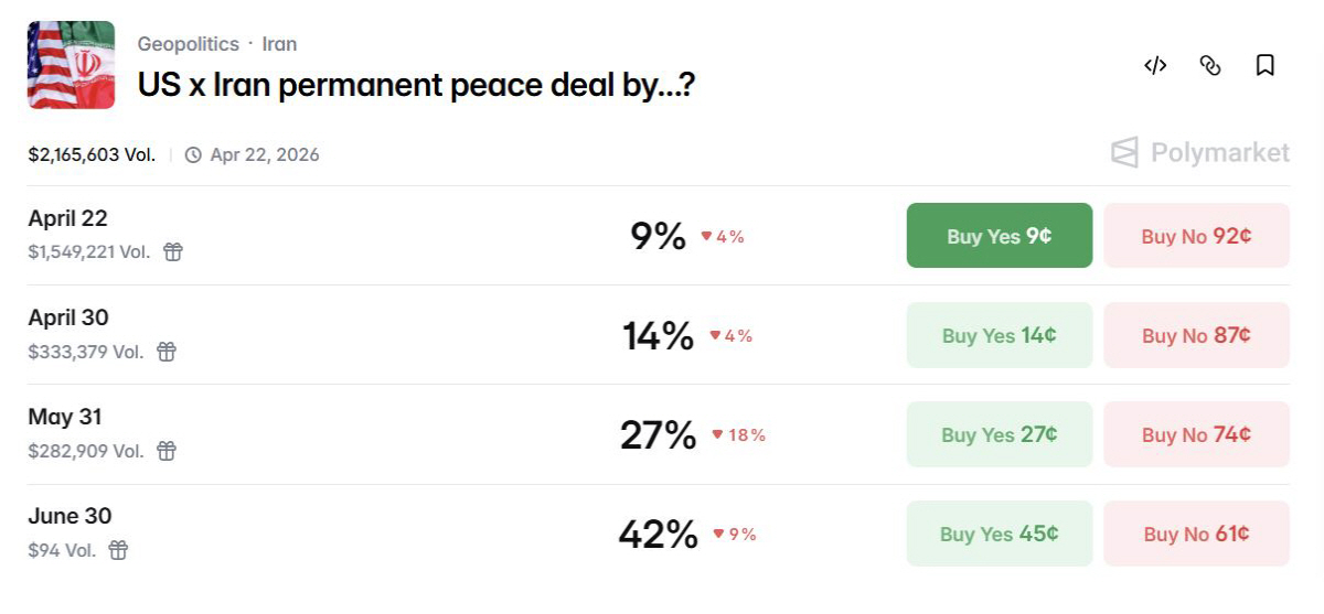 또한 예측시장 플랫폼 폴리마켓에서는 세 개 계정이 휴전 시점을 정확히 맞혀 60만 달러(약 9억원) 이상을 챙겼다. 거래자 신원은 아직 밝혀지지 않았다.
