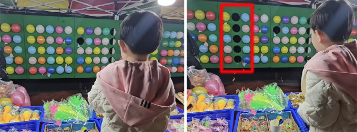 [스포츠조선 장종호 기자] 경기도 의정부의 한 야시장에서 어린 소년이 다트 하나로 풍선 5개를 연달아 터뜨리는 장면이 온라인에서 큰 화제를 모으고 있다.