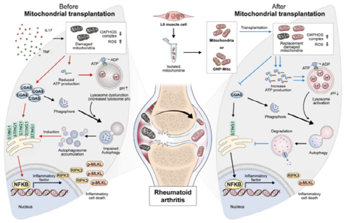 이러한 치료 효과는 실제 류마티스관절염 환자의 활막세포(FLS)에서도 재현되며 임상적 유의성을 입증했다. 특히 연구팀은 서강대학교 강태욱 교수팀과 협력하여 금 나노입자(GNP)를 결합해 미토콘드리아의 에너지 생산 효율을 극대화하고, 이식 후 기능적 안정성을 높이는 하이브리드 기술을 확보하며, 미토콘드리아 이식의 효능을 증가시키는 기술을 개발했다. 이는 실제 임상 환경에서 환자의 대사 시스템을 정상화할 수 있는 혁신적인 치료 패러다임의 탄생을 알리는 중요한 이정표가 될 전망이다.