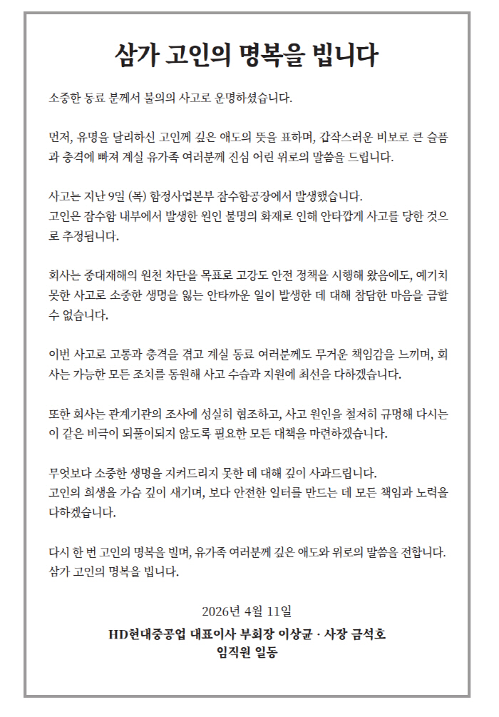 HD현대중공업이 일단 사고 직후 공식 사과하는 등 사태 수습에 나섰다. 지난 11일 이상균 부회장과 금석호 사장 명의의 담화문을 통해 "고인과 유가족에게 진심어린 애도와 위로를 전하고, 소중한 생명을 지키지 못한 데 대해 깊이 사과드린다"고 밝혔다. 이어 "중대재해 예방을 위해 안전 정책을 시행해 왔음에도 불구하고 사고가 발생해 참담한 심정"이라며 "사고 수습과 피해 지원에 가능한 모든 조치를 동원하겠다"고 강조했다.