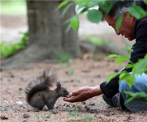 숲 인근에 사는 주민 김모(66)씨와 숲의 주인 청설모 '찌루'의 2년째 이어진 따뜻한 교감이 화제다.
