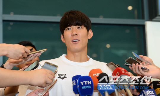 2017 국제수영연맹(FINA)헝가리 부다페스트 세계수영선수권대회에서 역영을 펼친 한국국가대표 수영 선수단이 1일 오후 인천공항을 통해 귀국했다. 대표팀 박태환(인천시청)이 입국장에서 취재진의 질문에 답하고 있다. 박태환은 6년만에 출전한 세계선수권대회에서 남자 자유형 400m 4위, 200m 8위를 기록했다. 안세현은 접영 100m 준결승과 결승에서 각각 한국신기록을 세웠고, 결승에 올라 5위로 선전했다. 김서영은 여자 개인 혼영 200m에서 한국 선수로는 6번째로 결승 진출에 성공했다. 인천공항=최문영 기자 deer@sportschosun.com /2017.08.01/ |
