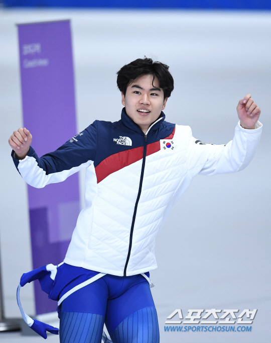 13일 오후 강원도 강릉 올림픽파크 스피드스케이팅 경기장에서 스피드스케이팅 남자 1,500m 경기가 열렸다. 김민석이 1분44초93을 기록하며 동메달을 차지했다. 경기를 마치고 동메달이 확정되자 환호하고 있는 김민석.