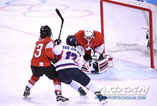 단일팀은 초반 강하게 밀어붙였다. 3분36초 좋은 기회를 잡았다. 임대넬이 혼전 중 퍽을 빼내 비하인드넷에서 크리스 앞에 있는 캐롤라인 박에게 연결했지만, 아쉽게 슈팅으로 연결되지 않았다. 4분4초에는 박예은이 먼거리서 슬랩샷을 날렸지만 골리 정면으로 갔다. 이후 스위스가 반격에 나섰지만 집중력 있는 수비와 신소정 골리의 선방으로 막았다. 단일팀은 계속해서 과감한 수비와 빠른 역습으로 만회골을 위해 사력을 다했다. 9분23초 기회를 잡았다. 이사벨 바이다허가 후킹 반칙으로 퇴장당하며 파워플레이 기회를 잡았다. 단일팀은 그리핀의 백핸드 슛을 비롯해 3~4차례 슈팅을 연결했지만 상대 골리를 넘지 못했다. 오히려 숏핸디드 실점의 위기를 맞았지만 신소정 골리가 잘 넘겼다. 신소정은 12분34초와 14분8초 스위스의 노마크 슈팅까지 모조리 막아내는 신기에 가까운 방어능력을 보였다. 단일팀은 막판 체력이 떨어졌지만, 마지막까지 집중력을 잃지 않고 상대의 공격을 막아냈다. 한국은 막판 엠티넷 플레이에 나섰지만 끝내 득점에 실패했다. 결국 경기는 0대2로 끝이 났다.