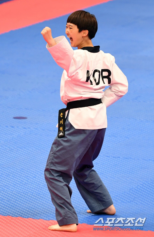 '2018 자카르타-팔렘방 아시안게임' 태권도 품새에 출전한 한국 윤지혜가 19일 인도네시아 자카르타 컨벤션 센터에서 열린 준결승 경기에서 경연을 펼치고 있다.
