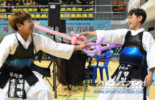 2018 전국 학교스포츠클럽 검도대회가 3일 세종특별시 세종시민체육관에서 열렸다. 체육관에서 경기외에 다채로운 행사가 펼쳐졌다. 아이들이 막대풍선으로 막는 죽도로 즐겁게 놀고 있다. 세종=정재근 기자 cjg@sportschosun.com