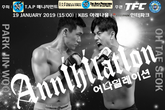 오태석은 19일 서울 화곡동 KBS아레나에서 개최하는 '어나힐레이션 1'에서 T.A.P 비밀병기 박진우와 -68㎏ 계약체중매치를 치른다.