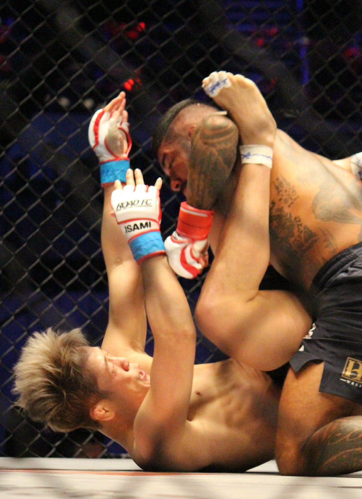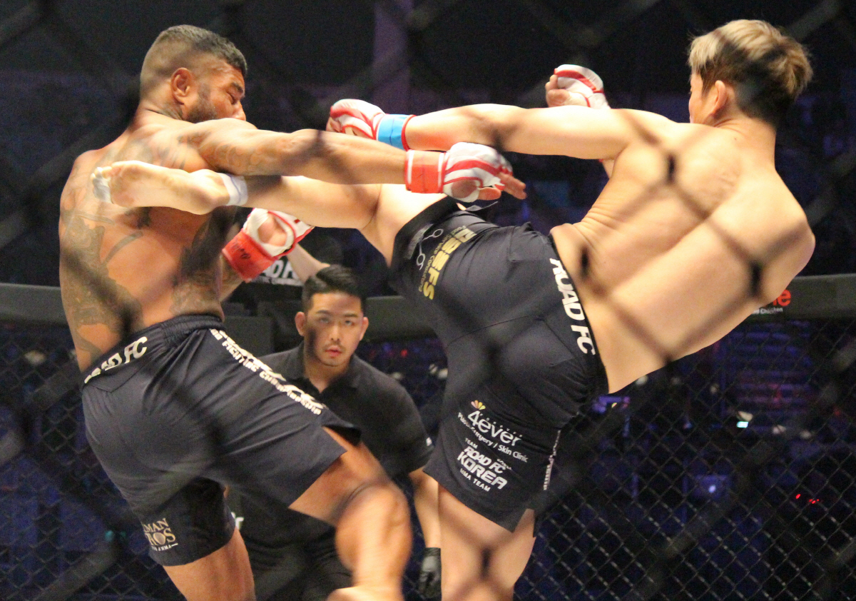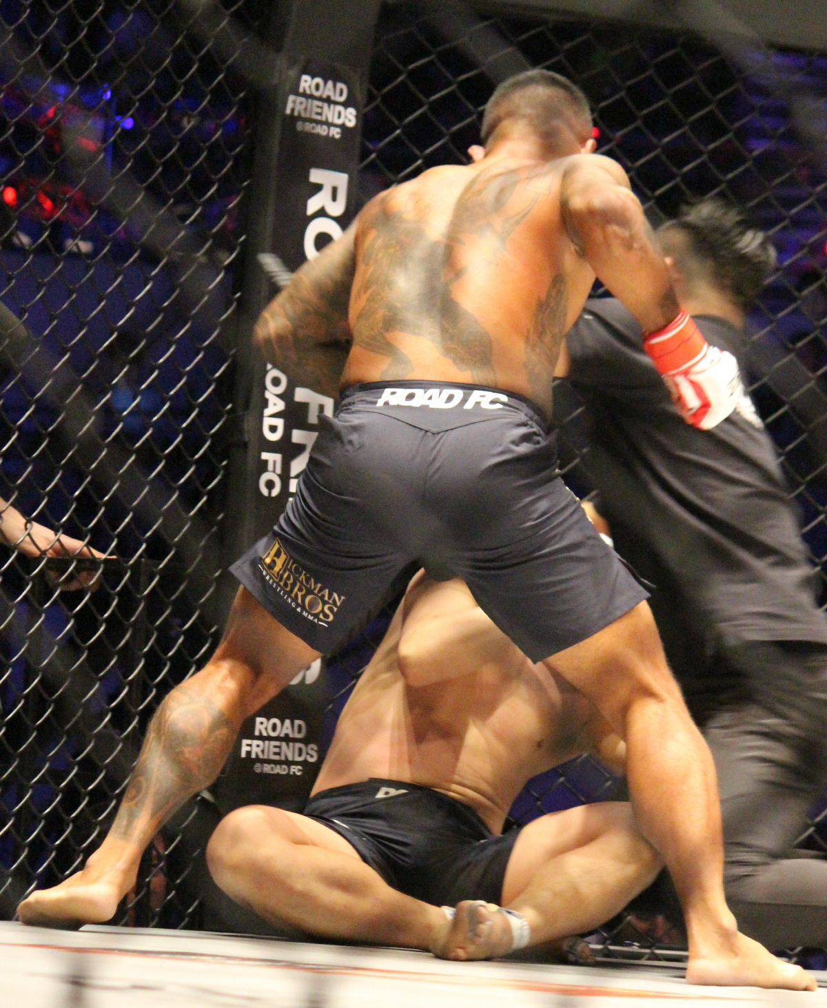홍영기가 계속 공격을 하면서 미란다를 넘어뜨리고 파운딩까지 갔으나 미란다가 다시 일어나 태세를 정비했고, 홍영기는 계속된 공격으로 오히려 체력이 소진됐다. 미란다는 이 기회를 놓치지 않고 홍영기를 밀어부쳤고, 결국 홍영기가 수비를 포기하면서 심판이 경기를 중단시켰다. 이로써 미란다는 김원기 김승연에 이어 홍영기까지 한국인 파이터를 모두 꺾었다. 장충=권인하 기자 indyk@sportschosun.com