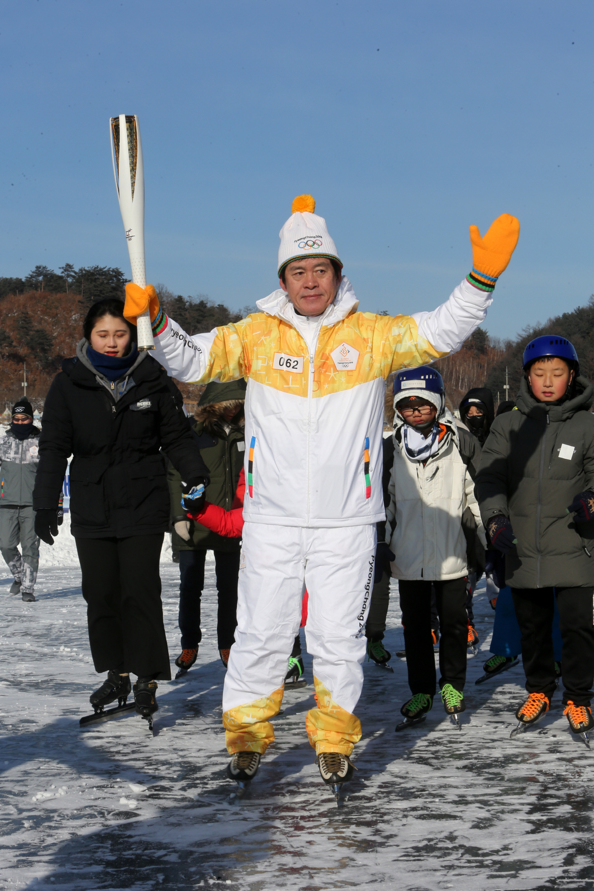 2018년 1월 25일 인제 남면 빙어호에서 2018평창동계올림픽 성화 봉송을 하는 이영하 전 감독. <저작권자(c) 연합뉴스, 무단 전재-재배포 금지>