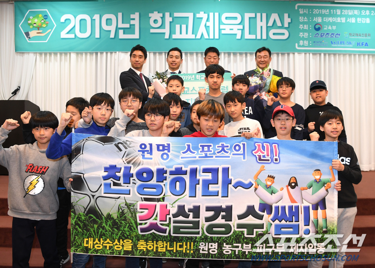 '2019 학교체육대상' 시상식이 28일 오후 서울 양재동 더케이호텔에서 열렸다. 학교스포츠클럽지도부문을 수상한 서울원명초 설경수, 대전중 문영길, 서울경인고 정선목 교사가 신진용 체육예술교육과장, 원명초 학생들과 함께 기념촬영을 하고 있다.