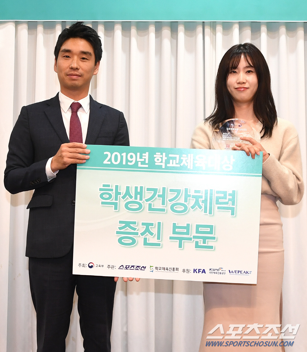 '2019 학교체육대상' 시상식이 28일 오후 서울 양재동 더케이호텔에서 열렸다. 학생건강체력 증진 개인부문을 수상한 경남반송여중 강유경 교사가 신진용 체육예술교육과장(왼쪽)과 기념촬영을 하고 있다.
