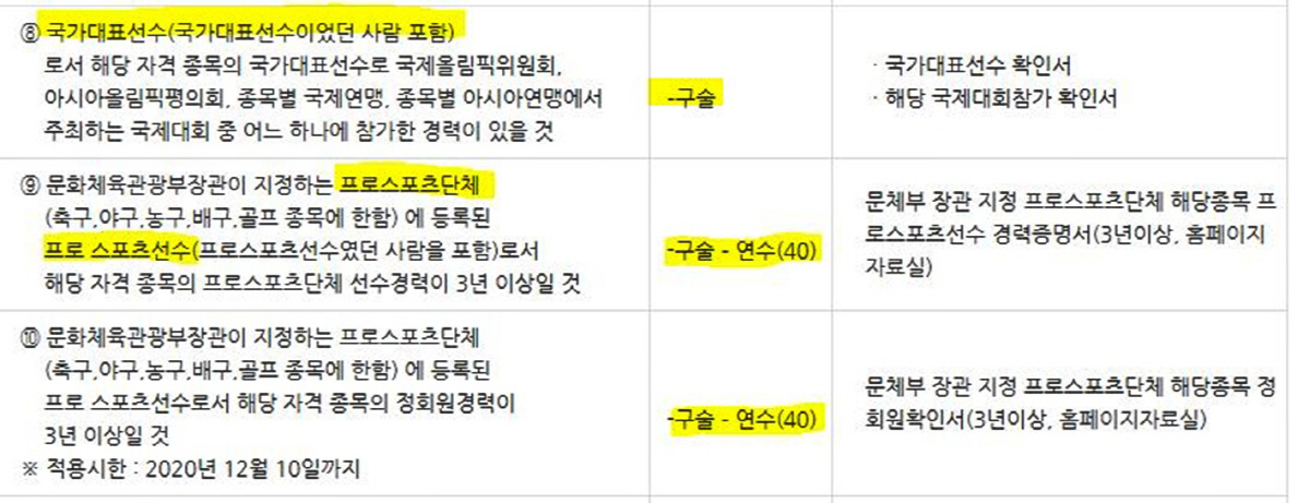 국민체육진흥공단이 주관하는 2급 전문스포츠지도사 시험은 필기, 실기, 구술, 연수 4단계로 이뤄지지만 국가대표로 국제올림픽위원회(IOC), 아시아올림픽평의회(OCA), 종목별 국제연맹(IF), 종목별 아시아연맹에서 주최하는 국제대회 중 어느 하나에 참가 경력이 있는 사람은 구술시험만 치르면 된다. 문화체육관광부 장관이 지정하는 프로스포츠단체(축구·야구·농구·배구·골프)에 등록된 현직 프로 선수나 프로 선수로 3년 이상 선수 경력이 있는 사람도 구술과 연수 시험만 치르면 된다.