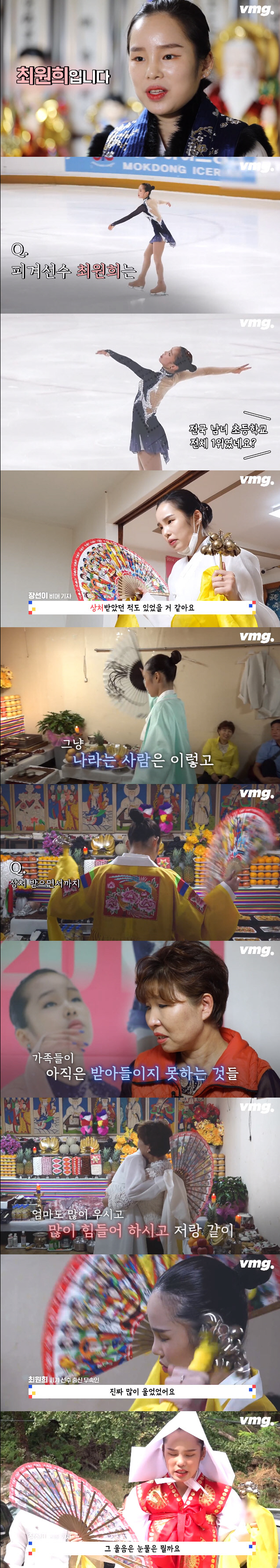 최원희는 "가족 중에 엄마만 저를 지지해주신다. 엄마도 많이 우시고 저랑 같이 힘들어하신다"며 "신당을 차리고 처음 앉았을 때 진짜 많이 울었다. 이제 제 첫 번째 인생이 끝났다는 게 실감이 됐던 것 같다. 피겨와 무속인, 두 가지를 같이 끌고 갔으면 좋겠다란 생각을 했었는데 완전히 끝났다는 확신이 들었다. 이제는 이 길을 완벽하게 가야한다는 다짐도 생겼다"고 말했다.