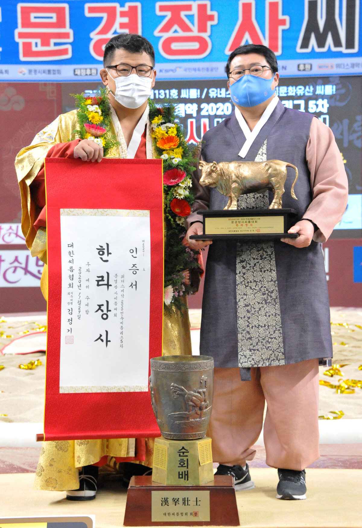 한편, 하루 뒤인 29일에도 모래판이 눈물바다로 변했다. 우형원(용인백옥쌀)이 데뷔한 지 17년이 되는 해에 처음으로 한라장사(105㎏ 이하) 타이틀을 거머쥐었다. 만 39세 베테랑의 정상 등극에 장덕제 용인백옥쌀 감독도 눈물을 참지 못했다.