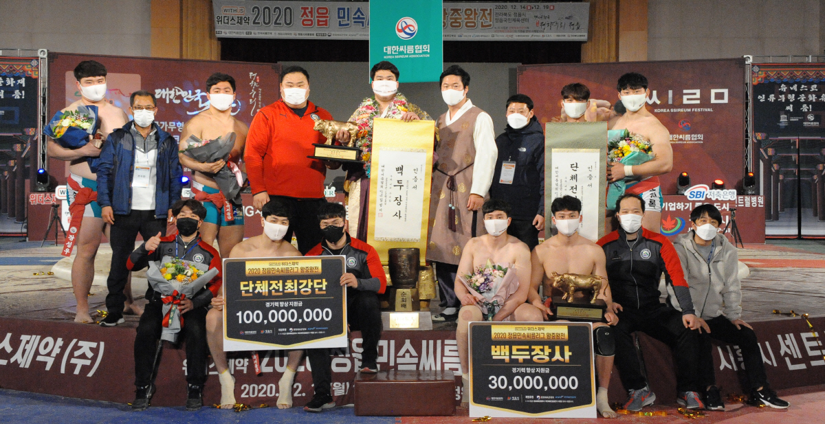 잠시의 틈을 두고 진행된 마지막 3경기. 물러섬이 없었다. 두 팀 모두 엎치락뒤치락 하며 2-2 팽팽하게 맞섰다. 집중력에서 영암군민속씨름단이 웃었다. 이병훈과 김명기가 연달아 승리를 거두며 팀 스코어 4-2, 결정전 스코어 2대1로 왕좌를 차지했다.