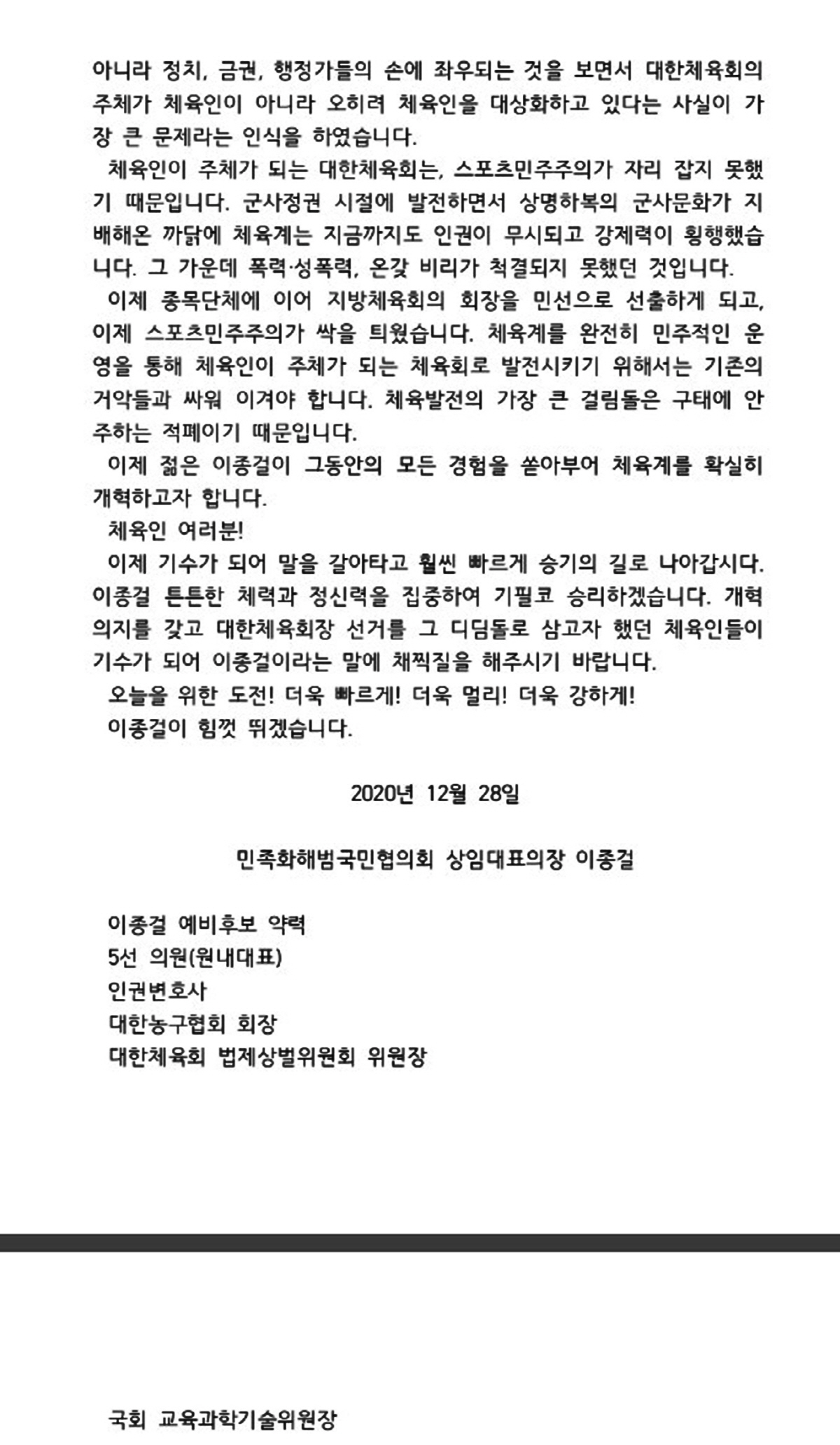 "장영달 선배 대신"'5선'이종걸 전의원,대한체육회장 전격 출마선언...28~29일 후보등록