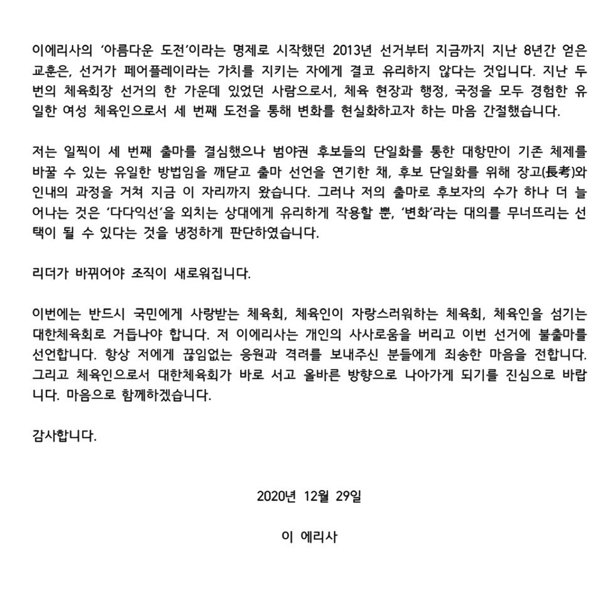 '저 이에리사는 개인의 사사로움을 버리고 이번 선거에 불출마를 선언한다'고 밝혔다. '항상 저에게 끊임없는 응원과 격려를 보내주신 분들에게 죄송한 마음을 전한다. 그리고 체육인으로서 대한체육회가 바로 서고 올바른 방향으로 나아가게 되기를 진심으로 바란다. 마음으로 함께하겠다'는 뜻을 전했다.