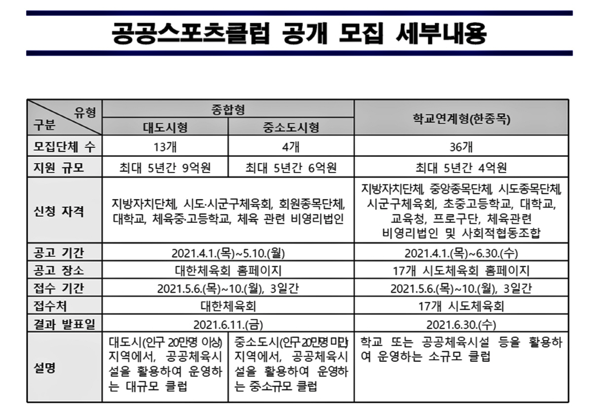 대한체육회는 대도시형(인구 20만명 이상) 13개소, 중소도시형(인구 20만명 미만) 4개소, 학교연계형(1종목) 36개소 등 총 53개소 신규 클럽을 선정할 예정으로, 선정된 단체는 최대 5년간 대도시형 9억원, 중소도시형 6억원, 학교연계형(한종목) 4억원을 지원받는다. 공모에 대한 보다 자세한 사항은 대한체육회 홈페이지 '공지사항' 메뉴를 통해 확인하면 된다.