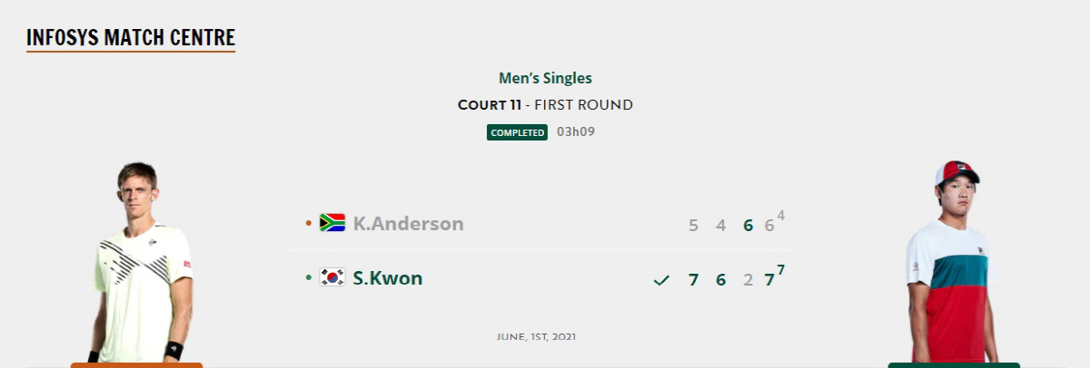 권순우는 1일 오후(현지시각) 프랑스 파리 스타드 롤랑가로스에서 열린 케빈 앤더슨(100위·남아공)과의 1회전에서 3대1(7-5, 6-4, 2-6, 7-6<7-4>)로 승리했다. 권순우는 지난해 US오픈에 이어 개인 통산 두번째 메이더대회 단식 본선 승리를 거뒀다.