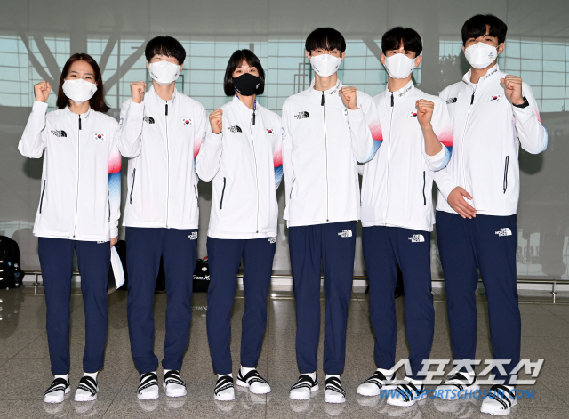 도쿄올림픽에 출전하는 태권도 대표팀 선수단이 21일 인천공항을 통해 출국했다. 출국전 선수들이 파이팅과 함께 포즈를 취하고 있다. 왼쪽부터 심재영 이다빈 이아름 장준 이대훈 인교돈. 인천공항=허상욱 기자 wook@sportschosun.com/2021.07.21/