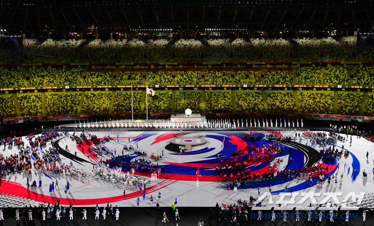 2020 도쿄 패럴림픽 개회식이 24일 오후 8시 일본 도쿄 국립경기장(올림픽 스타디움)에서 열렸다. 대한민국 선수단이 입장하자 태극기 문양이 표현되고 있다. 대한민국 선수단은 아프가니스탄 국기를 포함한 전체 163국 중 82번째로 입장했다. 한국의 자부심을 한껏 담아낸, 조선시대 당상관 관복의 훈색(분홍빛 계열) 저고리와 대님바지, 호랑이 문양과 금빛 동정을 새긴 한복을 입고 도쿄패럴림픽 도전에 나섰다. 기수는 보치아 대표팀의 최예진과, 그의 경기파트너인 어머니 문우영씨가 맡았다. 도쿄(일본)=사진공동취재단/정재근 기자 cjg@sportschosun.com