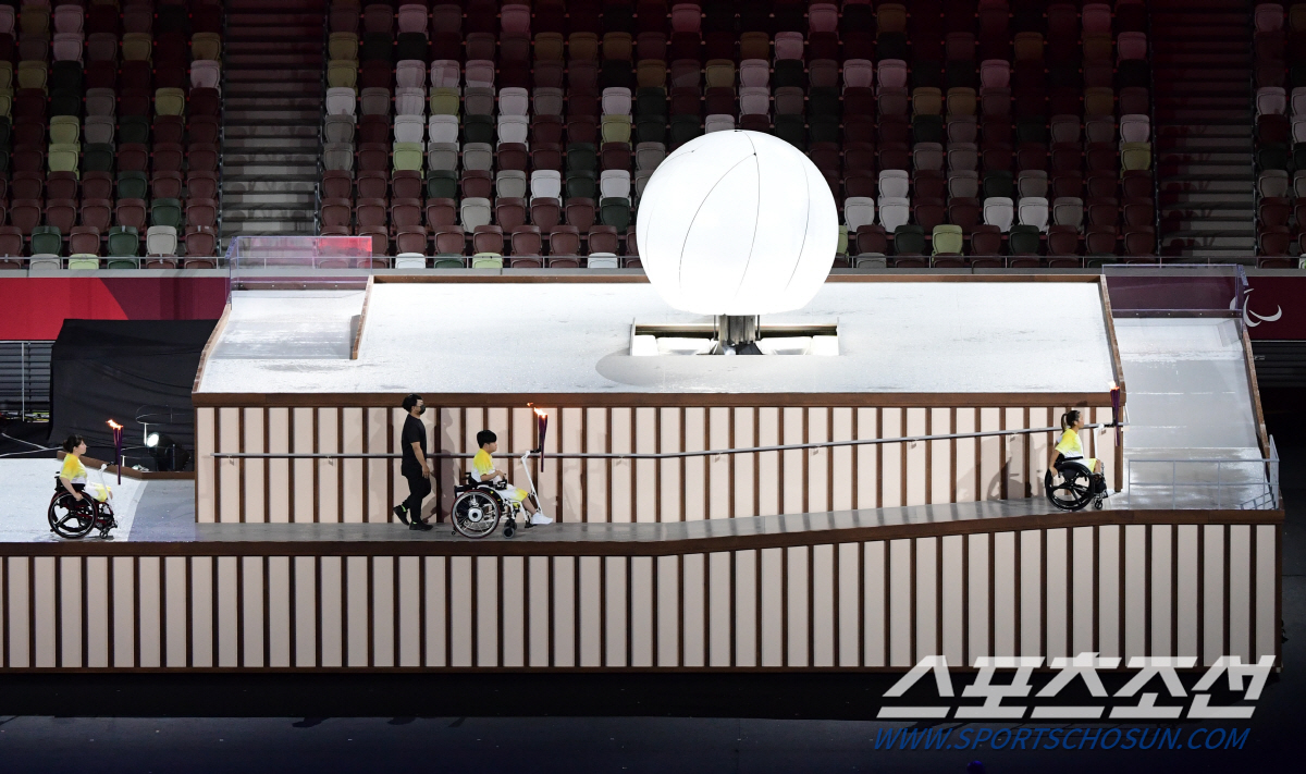 2020 도쿄 패럴림픽 개회식이 24일 오후 8시 일본 도쿄 국립경기장(올림픽 스타디움)에서 열렸다. 최종 주자 3명이 도움을 받지 않고 자신의 힘으로 성화대를 향해 올라가고 있다. 도쿄(일본)=사진공동취재단/정재근 기자 cjg@sportschosun.com