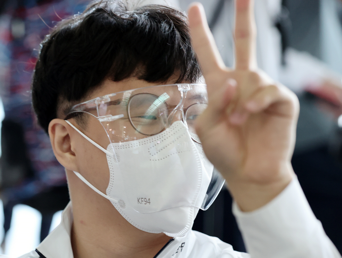 페이스쉴드 착용하고 출국하는 조기성<저작권자(c) 연합뉴스, 무단 전재-재배포 금지>