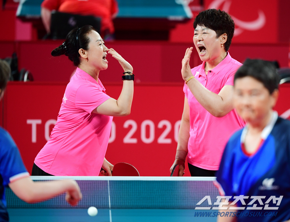 31일 일본 도쿄 메트로폴리탄 체육관에서 열린 2020 도쿄패럴림픽 탁구 여자 단체전(스포츠 등급6-8) 8강전에서 대한민국 이근우(왼쪽), 김성옥이 득점 후 기뻐하고 있다. 도쿄(일본)=사진공동취재단/정재근 기자 cjg@sportschosun.com
